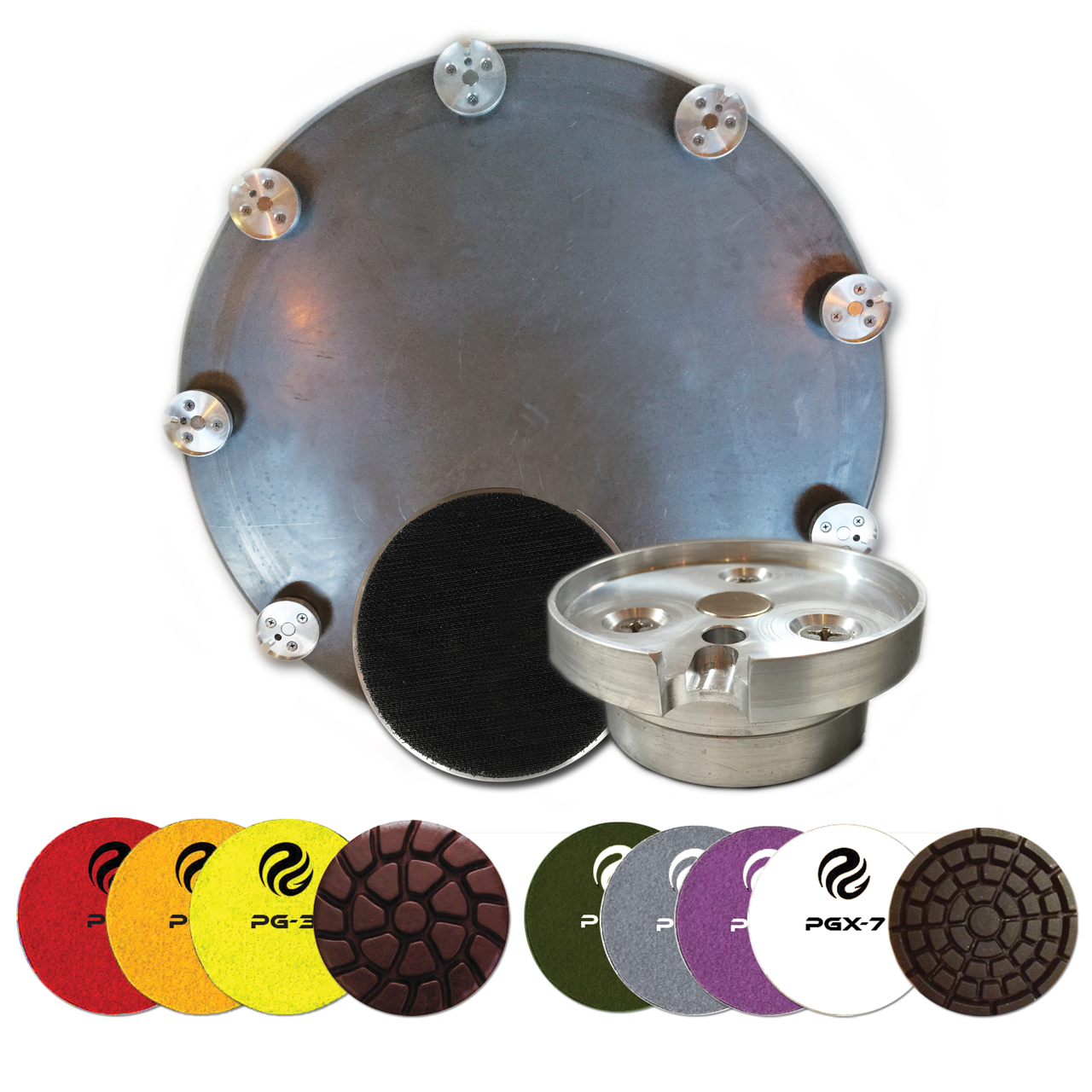 The Start-up Kit includes everything you need to start grinding and polishing with your power trowel! PowerFlexTM Drive Plate Kit for 36" Walk-Behind and Ride-On Power Trowels includes 1 x 36" PowerPan, 9 x PowerFlexTM Quick Release Magnetic Adapters and 9 x PowerFlexTM Hook and Loop Resin Adapters, and starter set of tooling, Grinding Steps 1, 2, 3 and polishing steps 4, 5, 6, 7.