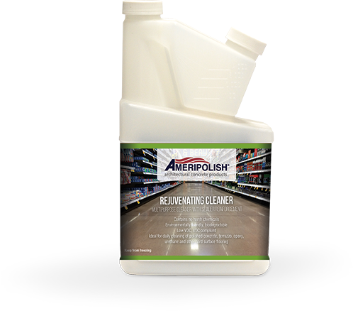Ameripolish® Rejuvenating Cleaner is a concentrated multipurpose cleaner that removes daily debris from hard surfaces, as well as reinforces the sealer to extend the life of polished concrete floors. Rejuvenating Cleaner contains no harsh chemicals, and leaves no build-up on the surface. In addition to polished concrete, it is ideal for use on vinyl tile, ceramic tile, terrazzo, wood, and composite materials. It rejuvenates the floor by reapplying trace amounts of densifier and stain resistant additives while you clean with an auto-scrubber. This allows the reapplication of SR2 as far out as every 2 years.