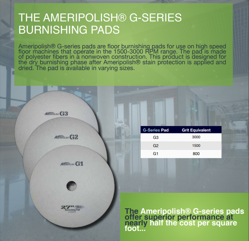 Ameripolish® G-series pads are floor burnishing pads for use on high speed floor machines that operate in the 1500-3000 RPM range. The pad is made of polyester fibers in a nonwoven construction. This product is designed for the dry burnishing phase after Ameripolish® stain protection is applied and dried.