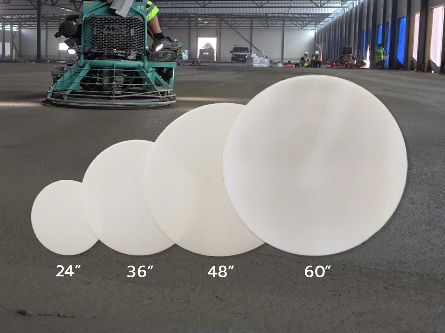 Thanks to the patented Concria Hook & Loop Fastener system, you can attach Concria plastic pans over your standard metal pans with Hook & Loop Fasteners. You can quickly change plastic pans to new ones. Plastic pans are available in all standard power trowel sizes from 24” edger up to 60” ride-on trowel pans.