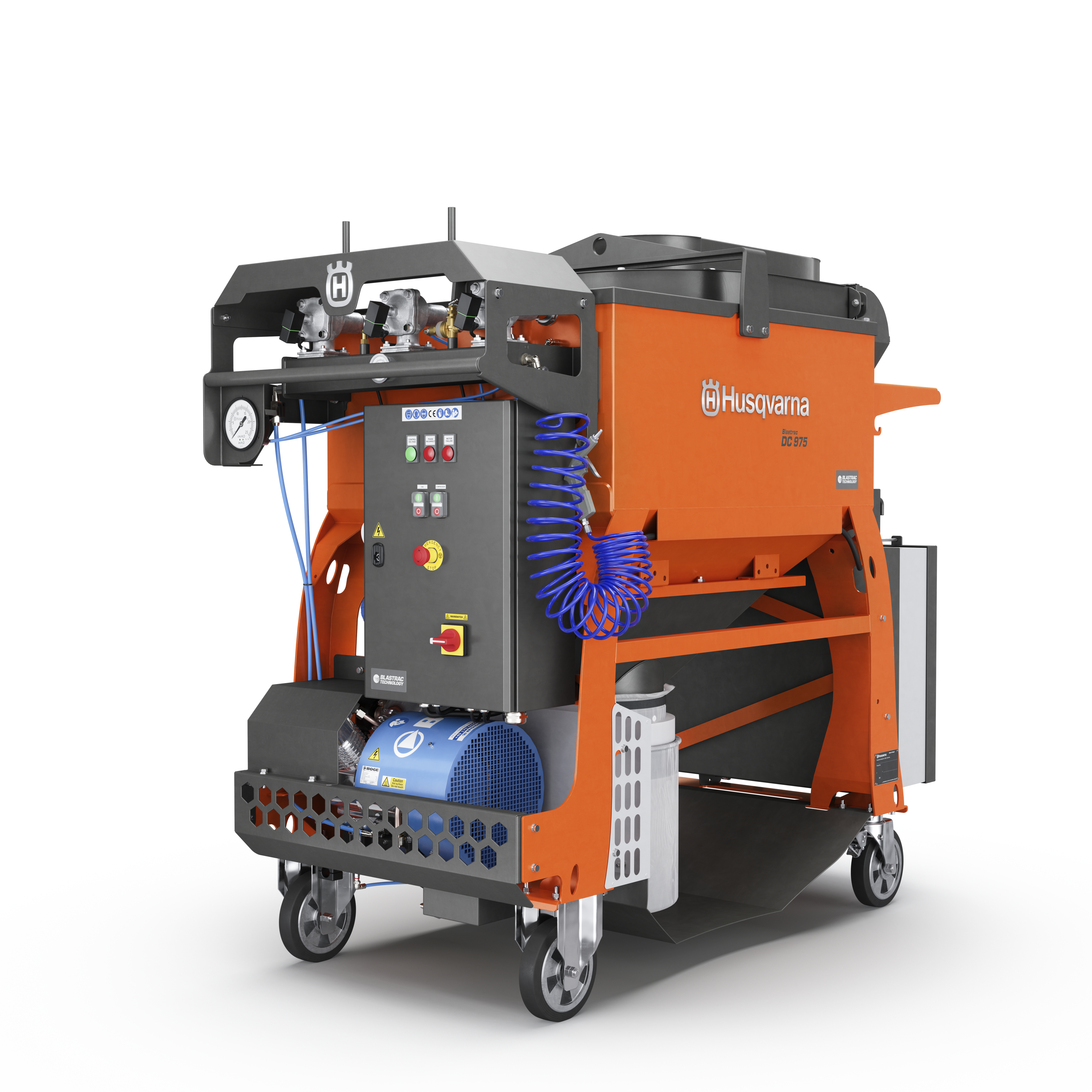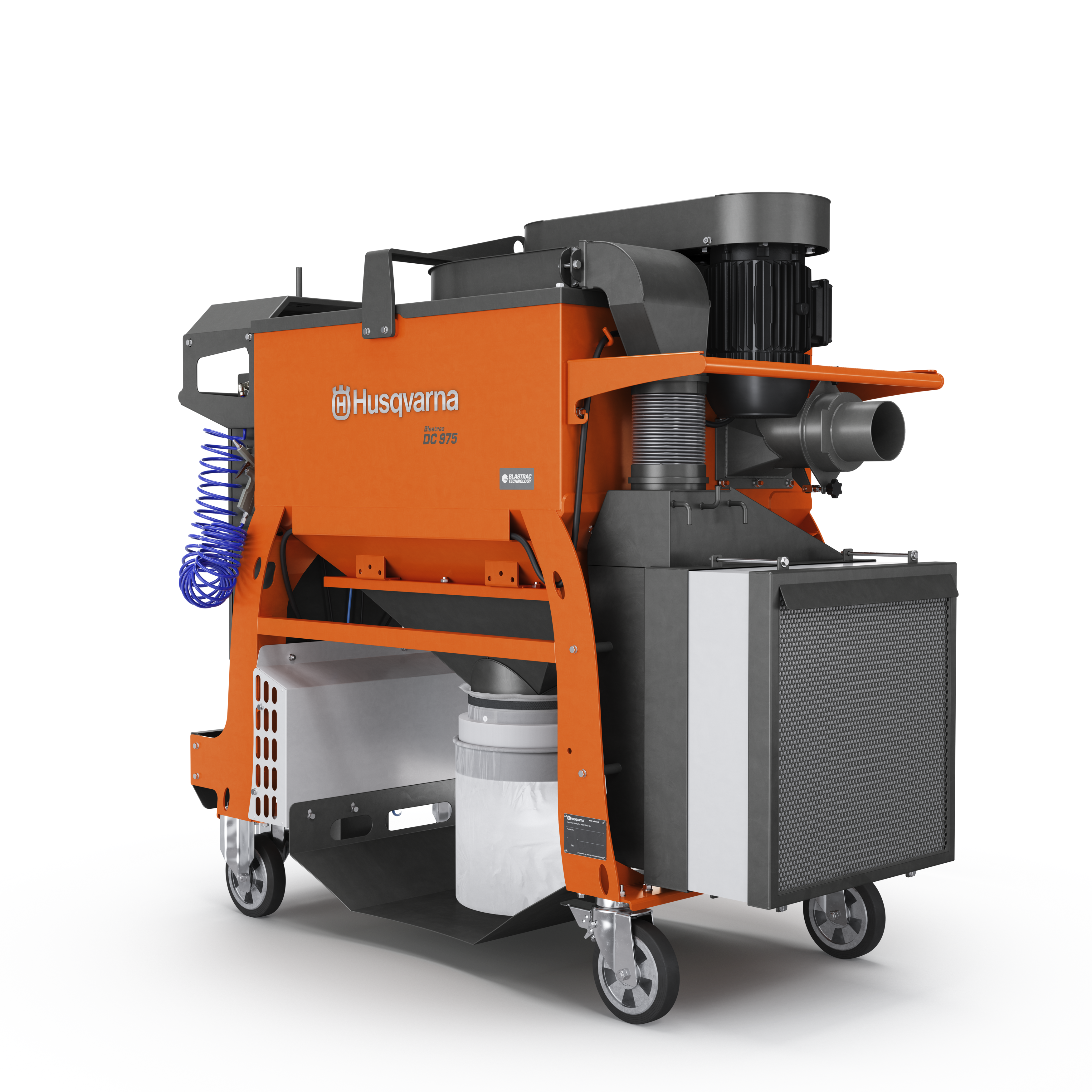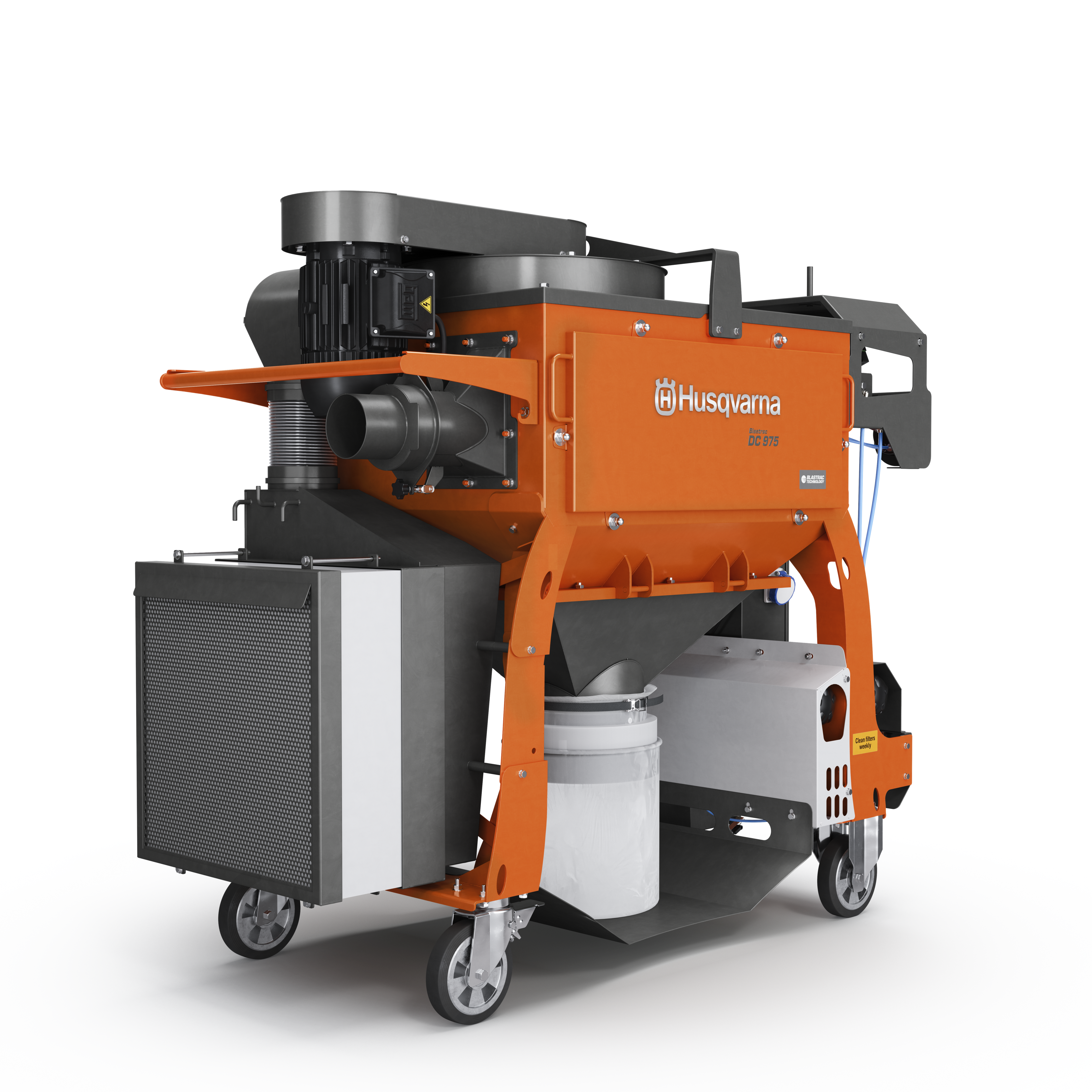 The Husqvarna Blastrac DC 975 heavy duty dust collection system combines power, efficiency, and productivity in one durable machine. Blastrac DC 975 is the preferred choice of professional contractors requiring uninterrupted operation and high performance. It is ideally suited for use with large size shot blasting, steel blasting and scarifying machines. It is equipped with nine M-class cartridge filters and an optional H14 HEPA filter kit can be added. Blastrac DC 975 is equipped with a dustbin kit. It can also be equipped with either with a Longopac system or a big bag system. The filters are automatically cleaned thanks to the pulse filter cleaning system