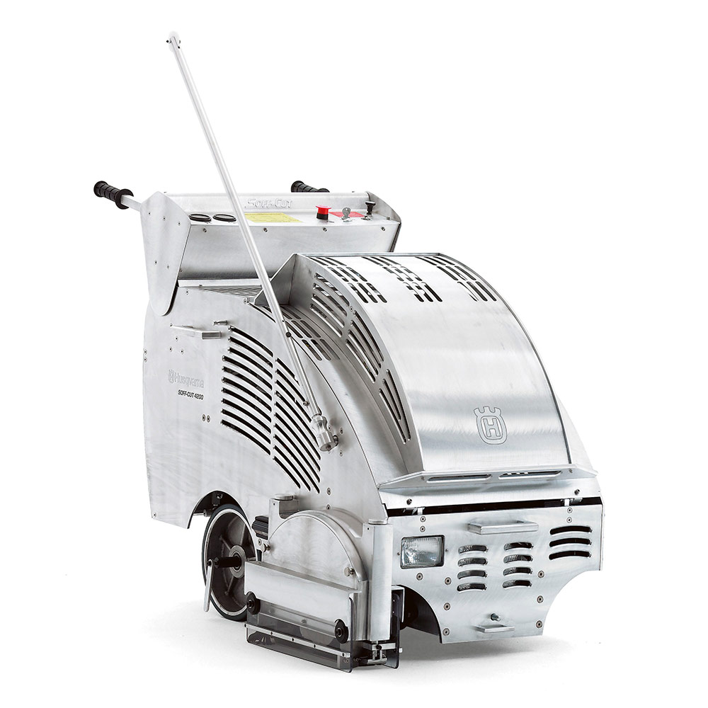 The Husqvarna 4200 self-propelled dry-cutting gasoline saw has a low-noise enclosed design and is ideal for heavy-duty commercial, industrial and paving applications. The 4200 is designed for peak performance. Features include a 23 hp twin-cylinder gasoline engine, three-stage cyclonic air cleaner, oil cooler, full-pressure oil lubrication, hydraulic valve lifters, mechanical fuel pump and oil alert light. Multiple blade widths can be used, allowing different joint widths and crack control simultaneously.