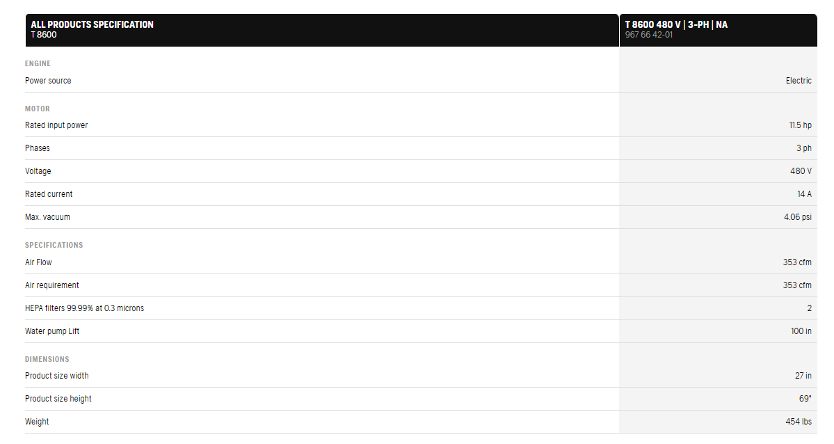 T 8600 is an effective industrial dust collector to match the grinding machines Husqvarna PG 820 RC, PG 820, PG 680 RC, PG 680, PG 530 and PG 400 as well as shavers, shot blasters and saws. Ideal for heavy-duty work and exacting demands on dust extraction. T 8600 is equipped with a quiet, yet powerful 480 V turbine motor delivering exceptional airflow. The machine can deal with materials that are difficult to handle, such as grinding dust and demolition materials in a wide variety of applications. Has a reliable filter system with high collecting efficiency and a long filter life, and can deal with large quantities of fine dust. Equipped with two oversized tested and certified HEPA class H13 filters and sock-style pre-filters that have earned a reputation for providing nonstop grinding and a long service life. The pre-filters can be cleaned from outside of the tank via Jet Pulse negative air pressure. The Longopac® bag hose system ensures simple, dust-free bag changes.