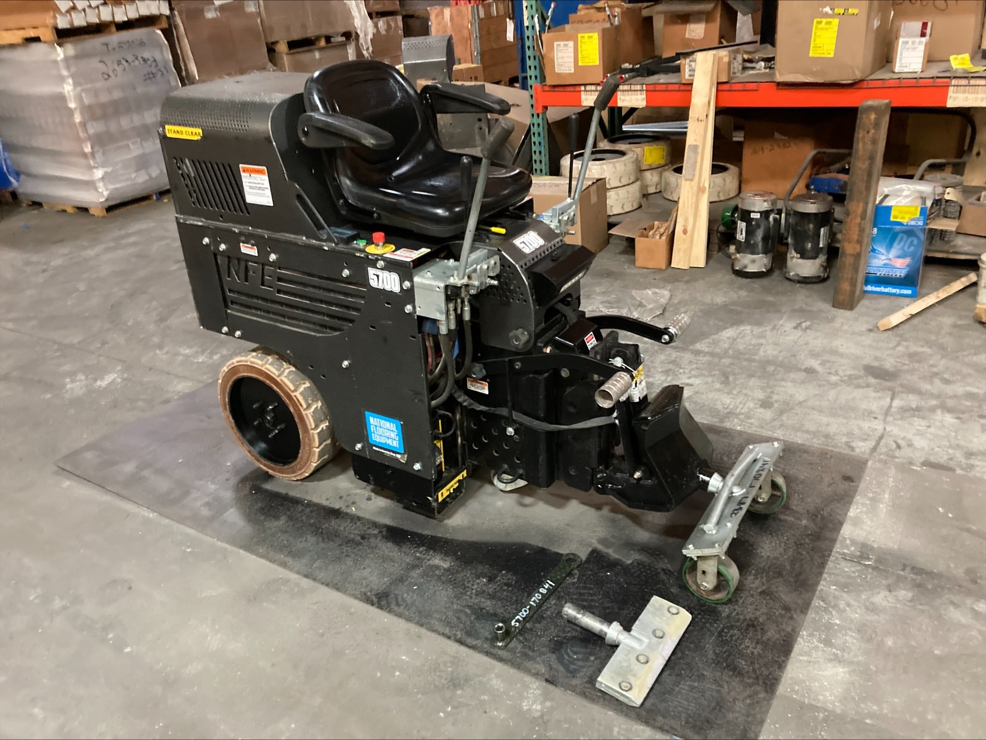 The 5700 is National's premium All Day Battery Ride-On scraper. This machine powers through an average eight hour day without requiring a battery recharge or electrical cord assistance. The 5700's built-in charging system is designed to be versatile, with the ability to plug into any outlet. This battery powered unit is ideal for indoor uses because it does not produce any harmful fumes or hazardous bi-products. With the machines weights removed, the 5700 will fit in residential elevators and is even narrow enough to fit in a 34 inch door, making this versatile machine ideal for operation on almost any jobsite!