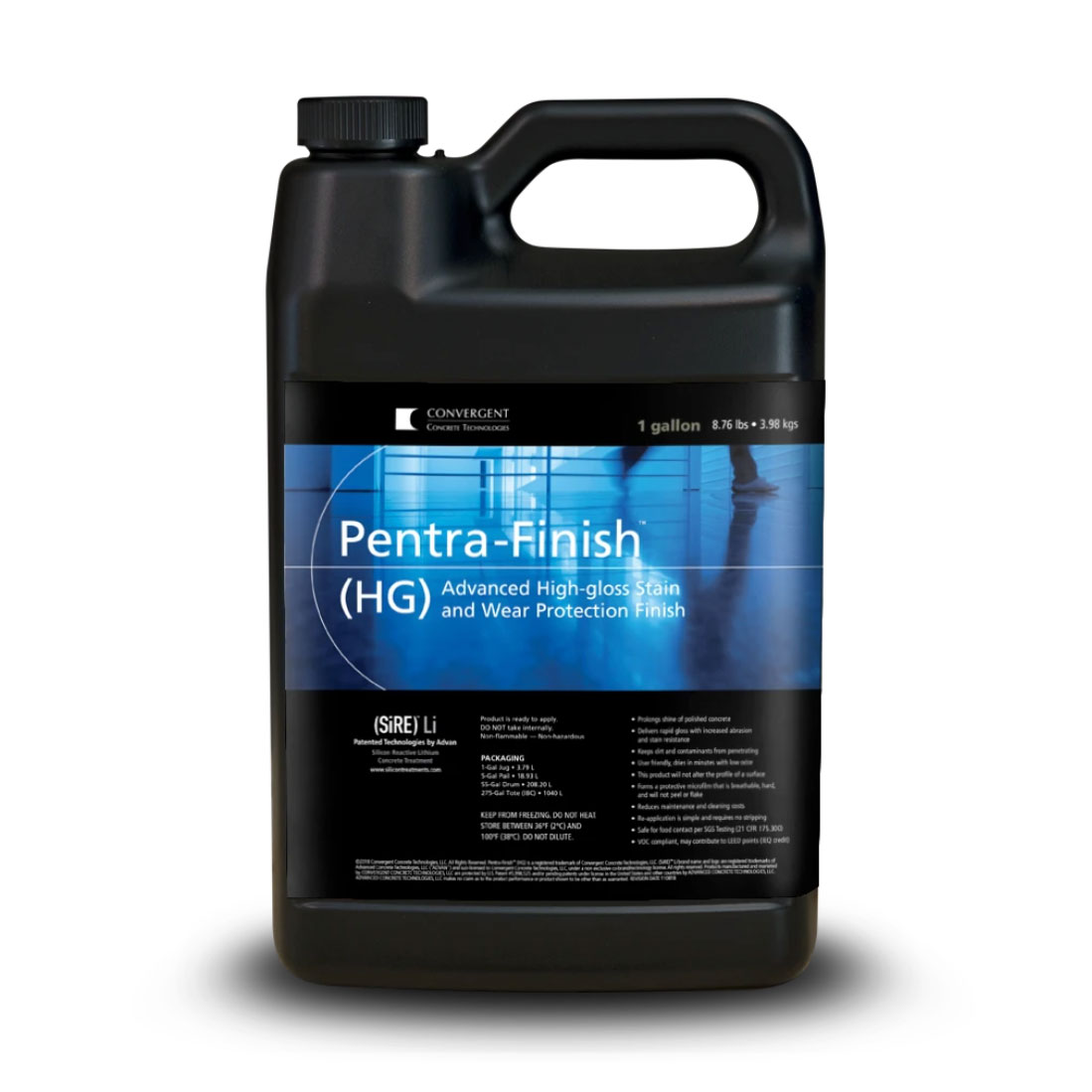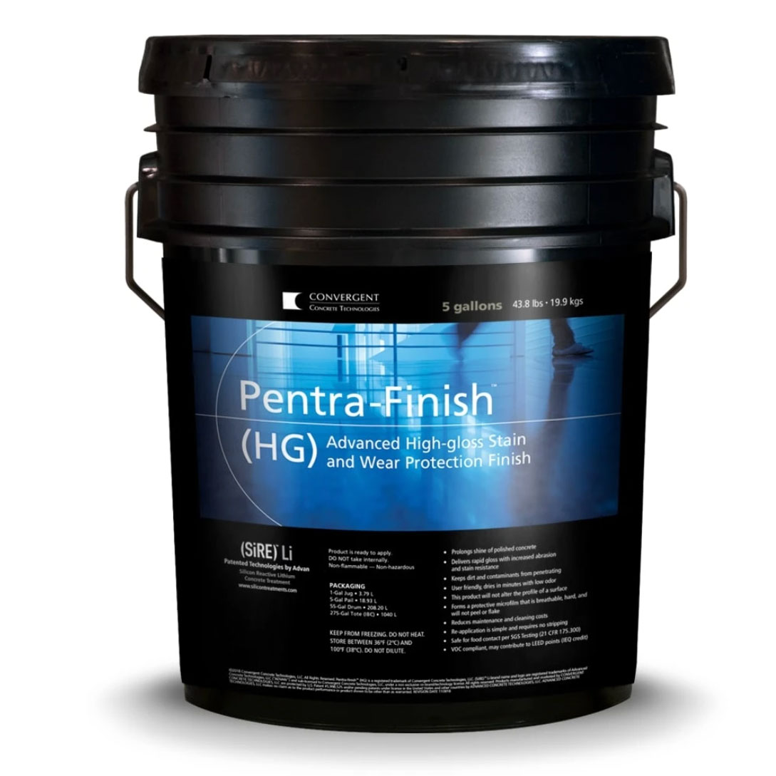 Pentra-Finish (HG) is a high-gloss, fast-drying lithium sealer that creates a microfilm on polished concrete, stone, terrazzo, masonry and other cementitious surfaces. This easy-to-use finish increases shine, enhances color and improves resistance against abrasion and stains. Pentra-Finish™ (HG) generally increases the coefficient of friction on polished surfaces. This non-toxic solution is ideal for integrally colored, dyed and stained polished concrete and is VOC compliant.