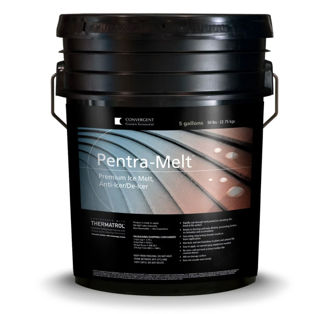 Pentra-Melt™ is a fast-acting de-icer for concrete driveways, sidewalks, ramps, steps, loading docks and decks. This industrial strength formula melts ice on contact as low as -80 degrees Farenheit (-62ºC). It works to separate ice from the surface, allowing for easy removal. Pentra-Melt™ can be used before or after a storm and is non-toxic to plant and animal life. It will not damage the concrete or leave residue.