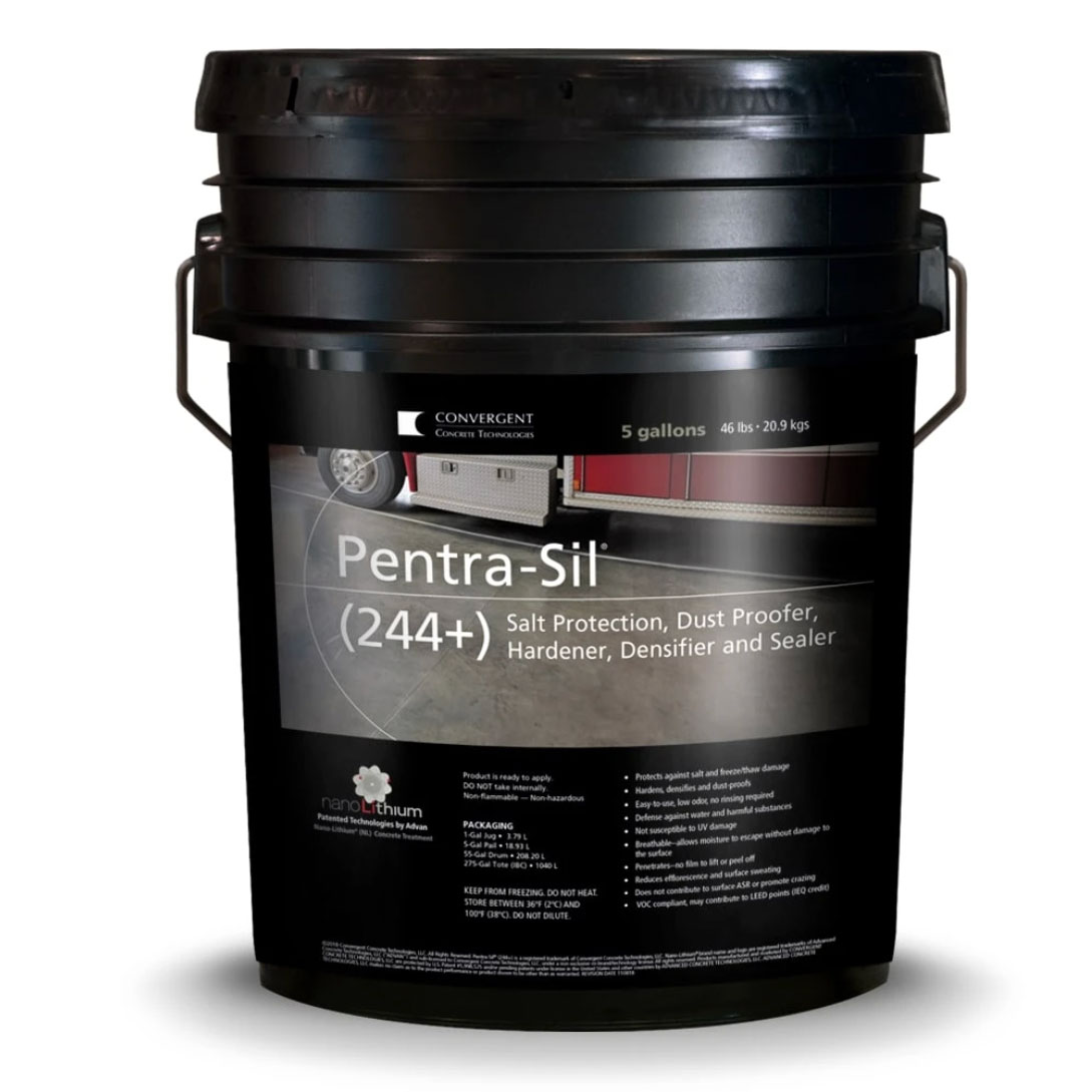 Pentra-Sil (244+) is a high-performance lithium hardener, densifier and sealer. It is formulated to protect existing concrete against damage from salt, freeze-thaw, moisture and steel corrosion. Pentra-Sil® (244+) reduces chloride ion intrusion, dustproofs, hardens and fortifies the surface. It is easy to use and VOC compliant.
