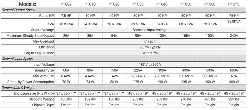 New for Fall 2019, the updated Phase Perfect® is a patented phase converting technology that supplies three-phase power from a single-phase source to power inductive, resistive and capacitive loads with distinct advantages over any existing converter technology. Utilizing the latest advances in solid state technology the Phase Perfect delivers its high quality power with remarkable efficiency (98.7%). The PT010 only consumes 74 Watts of power when in standby mode, and is easily installed with an included wall mount kit.