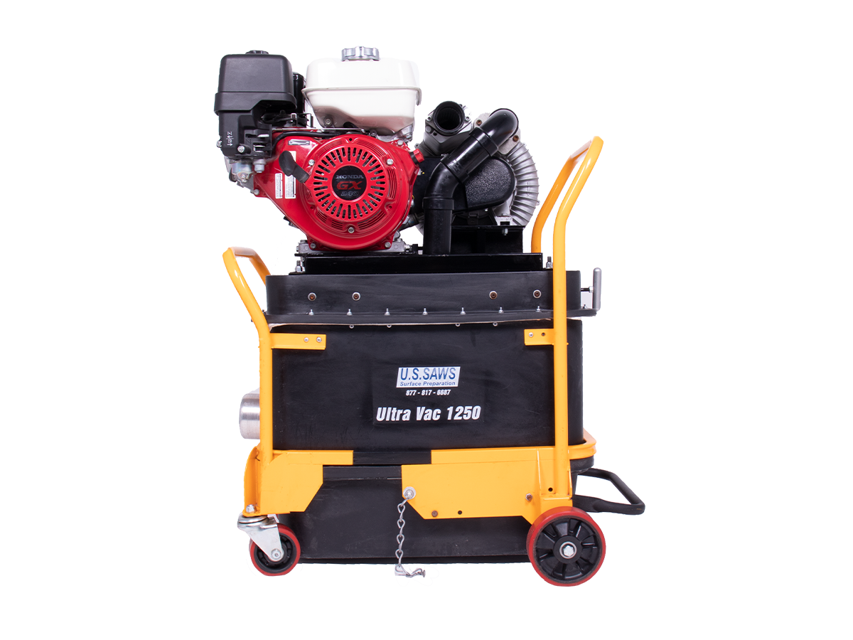 The U.S.SAWS Ultra-Vac 1250-G is a heavy duty vacuum designed for collecting concrete dust where a gas powered engine is most convenient. The 1250-G is the preferred vacuum system for the JS-131 & JS-160P Joint Cleanout Saw, the CC-100 Crack Chaser and a variety of Early Entry Saws. The wide, flat wheels make it a good choice for early entry control joint cutting as they will lessen the possibility of indentations in the slab. This machine is constructed of an all steel tube frame with a polyethylene body for years of use and abuse. Powered by a reliable Honda GX240. This vac comes with a 25’ 3” hose. The large 12 pleat polyfelt filter allows continued airflow even when the 12.5 gallon dust bin is near capacity. External HEPA filters and Longopac bagging systems are available options.