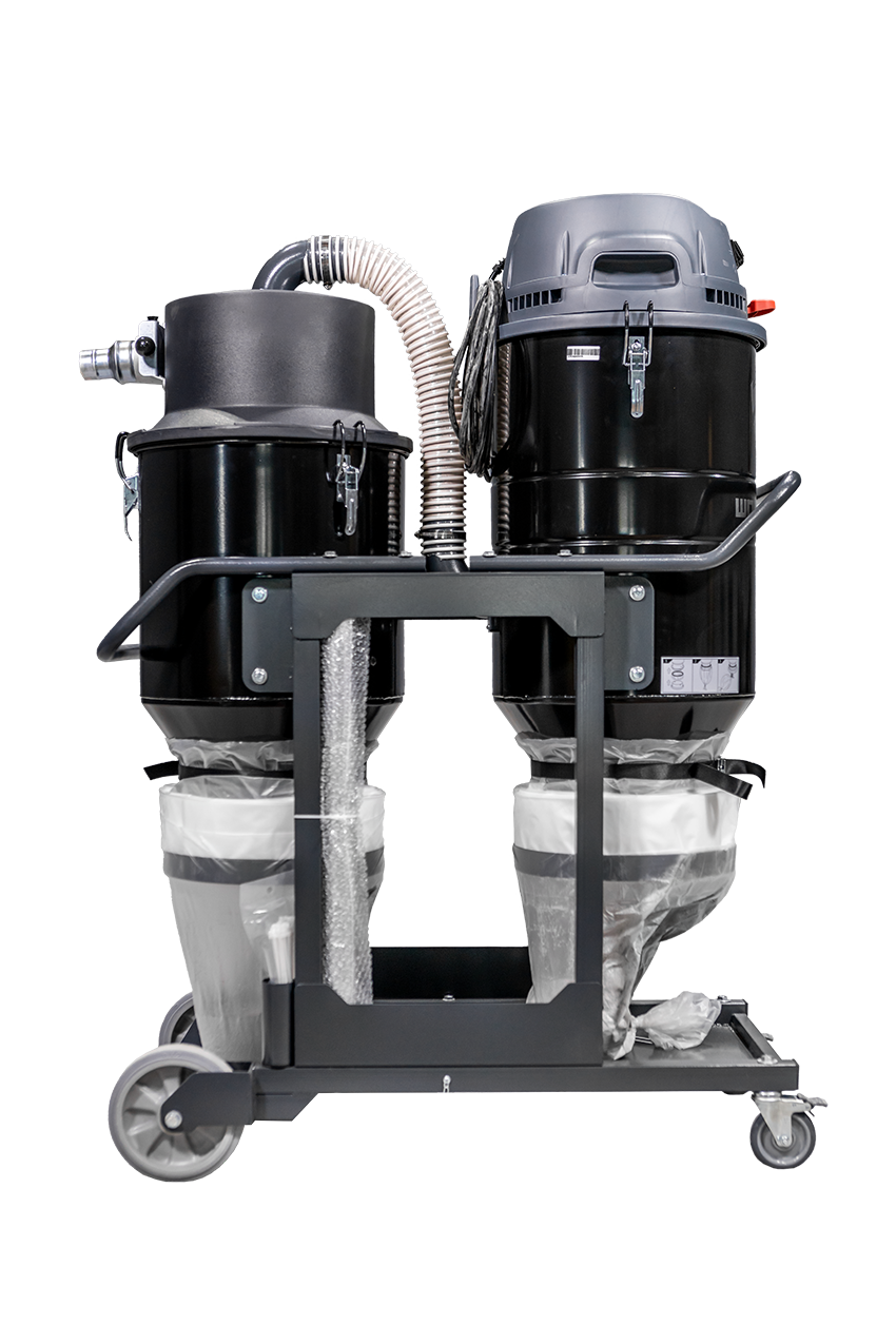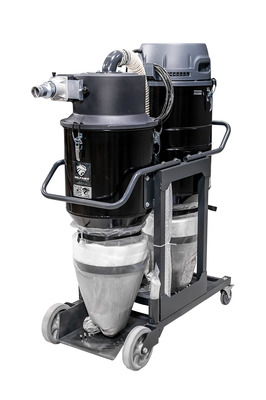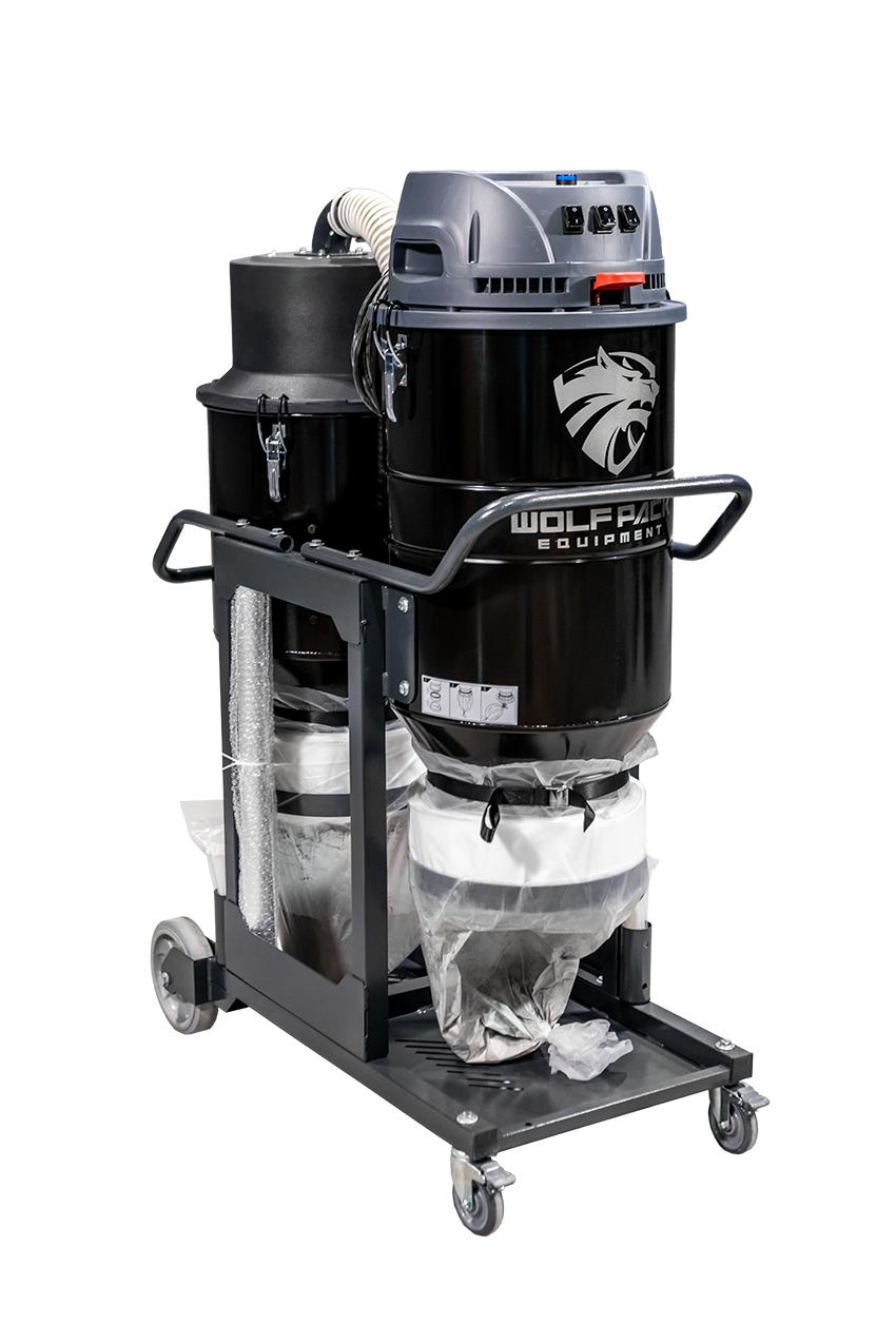 The WOLF VAC 3S w/ Separator is equipped with a manual lever that will clean the filter with a jet pulse. It includes floor cleaning tools and comes standard with a HEPA filter. There are no circuit boards, which provide simple operation settings and a collapsible frame for easy transport. When your dust extractor is prematurely clogging due to large quantities of material you are covered with the Separator. It captures 90% of the material BEFORE it reaches the dust extractor, keeping your dust extractor filters clean.